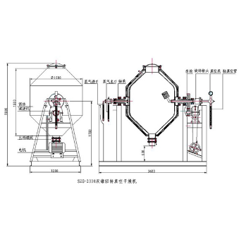 SZG雙錐回轉(zhuǎn)真空干燥機(jī)為雙錐形的回轉(zhuǎn)罐體,罐內(nèi)在真空狀態(tài)下,向夾套內(nèi)通入蒸汽或熱水進(jìn)行加熱,熱量通過(guò)罐體內(nèi)壁與濕物料接觸。濕物料吸熱后蒸發(fā)的水汽。通過(guò)真空泵經(jīng)真空排氣管被抽走。由于罐體內(nèi)處于真空狀態(tài),且罐體的回轉(zhuǎn)使物料不斷的上下,內(nèi)外翻動(dòng),故加快了物料的干燥速度,提高干燥效率,達(dá)到均勻干燥的目的。