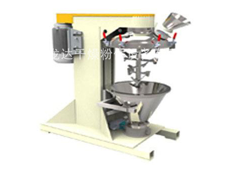 產(chǎn)品通過錐形混合腔頂部投入,投料范圍在30%-100%之間,設備中間有一個頂部驅(qū)動的高速轉(zhuǎn)軸,因此便去除了在產(chǎn)品區(qū)域的密封設計以及軸承。在軸上有緊貼內(nèi)壁的槳式混合原件。通過高速旋轉(zhuǎn)的攪拌槳和錐形內(nèi)倉的共同作用將產(chǎn)品由底部帶至混合腔的上部。當產(chǎn)品達到頂部的時候又重新回落到混合倉中心,如此的產(chǎn)品的方式形成了一種快速的宏觀混合。