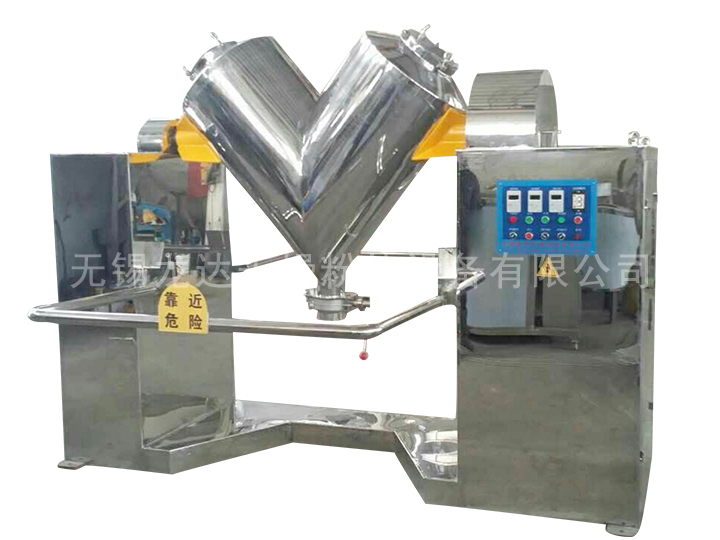 本機一端裝有電機與減速機,電機功率通過皮帶傳給減速機,減速機再通過聯(lián)軸器傳給V型桶。使V型桶連續(xù)運轉,帶動桶內物料在桶內上、下、左、右進行混合。