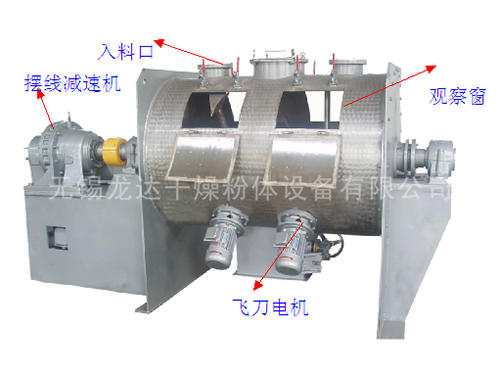 混合機(jī)啟動(dòng)后犁刀由犁刀軸帶動(dòng)旋轉(zhuǎn),使物料沿筒體徑向作周向湍動(dòng),同時(shí)把物料沿犁刀兩側(cè)面的法線方向拋出。當(dāng)被拋出和作周向湍動(dòng)的物料流經(jīng)飛刀組是時(shí),被高速旋轉(zhuǎn)的刀飛迅速、有力地拋散。物料在上述犁刀和飛刀的復(fù)合作用下,不斷更疊、擴(kuò)散、在短時(shí)間內(nèi)達(dá)到均勻混合,混合精度高。