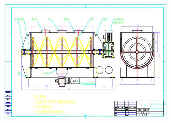混合機臥式筒體底部中央開設出料口,外層螺旋帶的蝸旋結(jié)構(gòu)配合主軸旋轉(zhuǎn)方向驅(qū)趕筒壁內(nèi)側(cè)物料至中央出料口出料,確保筒體內(nèi)物料出料無死角。